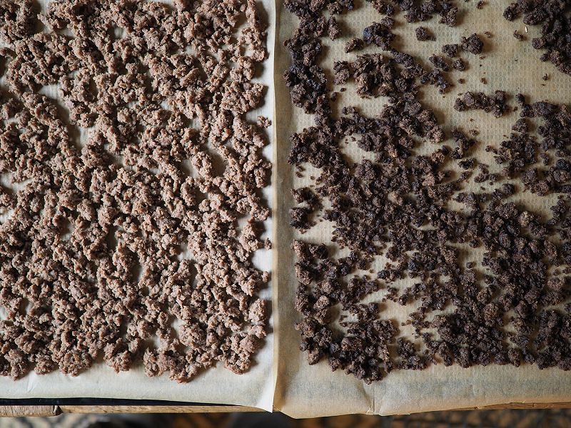 5. Высушивайте при температуре 63°С в течение 6 часов, пока мясо не потемнеет и не высохнет, время от времени удаляйте бумажной салфеткой лишний жир и разбивайте большие комки.